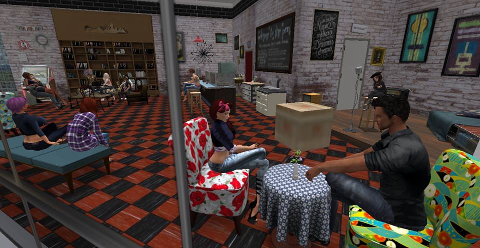 I thought long and hard about what was going to be my intro into sharing some of the excellent facets within Second Life. It didn’t take me long to realize the perfect starting point: the Espresso Yourself open mic night in the heart of Bay City- a serious personal favorite of mine. Held the first Tuesday of each month (hint hint: that means you can join in the fun this coming Tuesday) you will find an amazing mix of voices and visions as they take to the stage to perform, read, or even rant. There’s never two nights that are even remotely the same. Everyone who attends is welcome to take to the stage or participate as an engaging audience member.